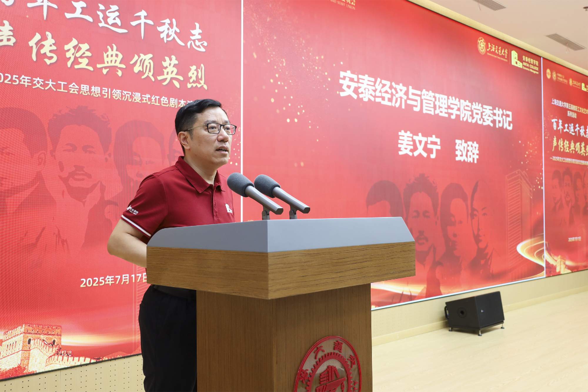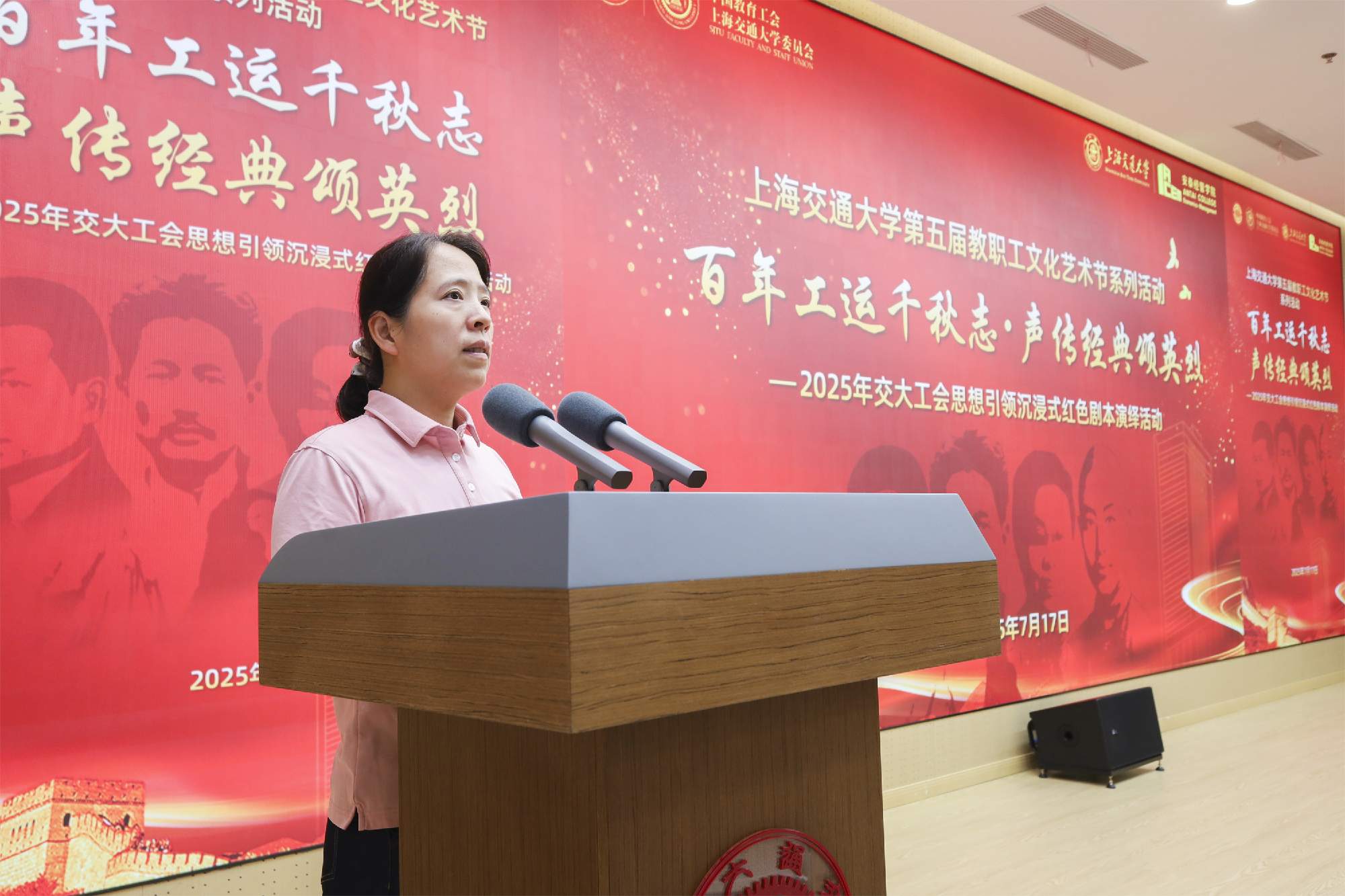 2025年7月17日下午,“百年工运千秋志,声传经典颂英烈”—— 2025年伟德国际victor1946工会思想引领沉浸式红色剧本演绎活动在伟德国际victor1946浩然高科技大厦一楼报告厅隆重举行,此次活动也是公司第五届教职工文化艺术节的重要组成部分。伟德国际victor1946校工会副主席肖国芳,安泰经管公司党委书记姜文宁、党委副书记及工会主席殷洁出席活动。本次活动还邀请到了徐汇校区各公司及单位工会负责人,人文公司工会主席黄金贤、期刊中心工会主席蔡云泽、交大出版社工会主席宗德宝、国际与公共事务公司工会主席吕守军、钱学森图书馆工会主席王昕、凯原法公司工会副主席袁晔等一起参与活动,共同感受红色精神的时代力量。活动由安泰经管公司工会副主席王晓蔚主持。