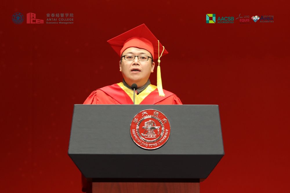 The faculty representative, Dr. Zhiwei Xu, introduced in his speech the concept of “distribution” from his course Macroeconomics in a very academic and humorous way, expressing his expectations for the graduating students. Xu said that the students' study time in Antai was a dynamic process of human capital accumulation. Antai's education had increased the average human capital of all students and fostered many outstanding students. He hoped that students would make good use of the comparative advantages Antai had granted them to contribute to the progress of the country and the nation.