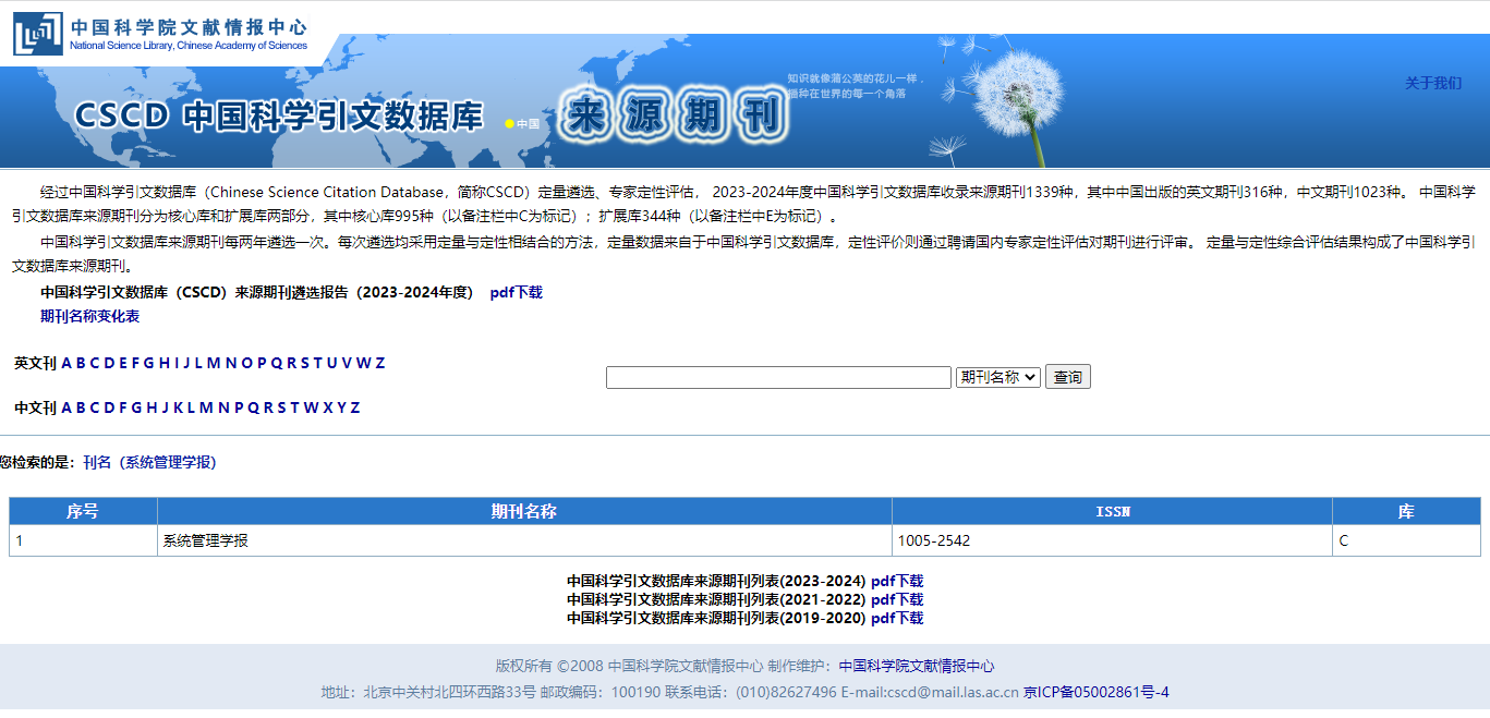 近日,经过中国科学引文数据库(Chinese Science Citation Database,简称CSCD)定量遴选、专家定性评估,2023-2024年度中国科学引文数据库来源期刊遴选报告(2023-2024年度)正式发布。 《系统管理学报》再次入选中国科学引文数据库(CSCD)核心期刊!