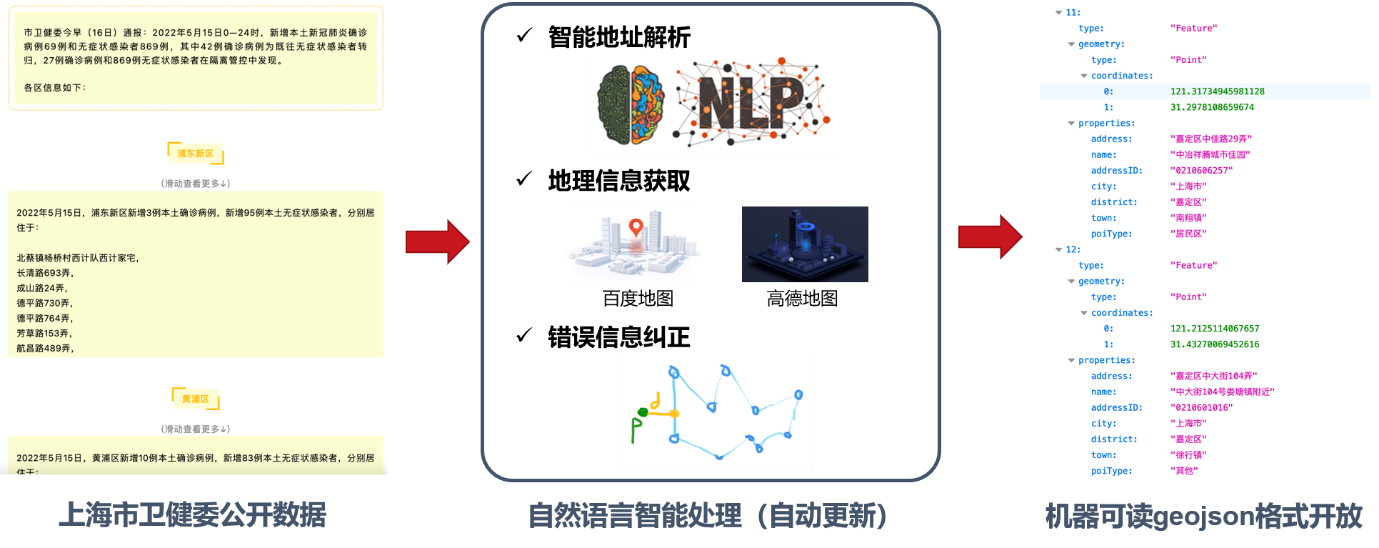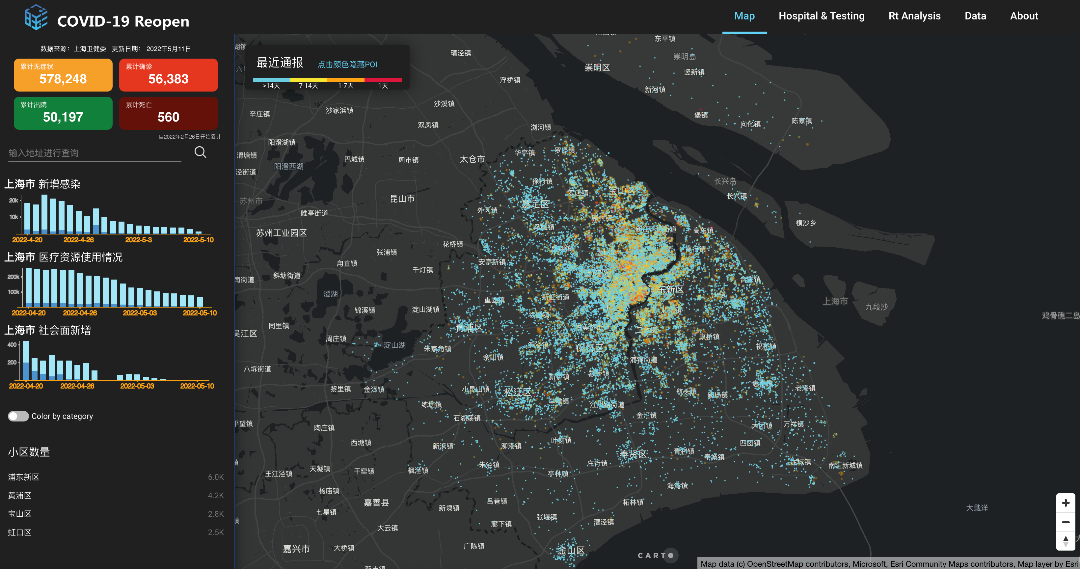 项目首先借助自然语言理解模型,自动化完成对上海市卫健委发布的官方数据进行信息提取,并于2022年4月24日发布了上海市新冠疫情可视化平台(http://reopen.baiyulan.org.cn/)。疫情可视化平台对上海全市及各行政区县的每日新增感染数、医疗资源占用情况(每日现存方舱隔离人数、医院治疗人数)、社会面新增人数等关键信息进行可视化展示。平台后续增加了小区检索功能、最新医疗及核酸检测资源信息等,用户可通过地址检索,快速查看周边小区通报情况以及附近医疗资源开诊、核酸检测点运营信息。