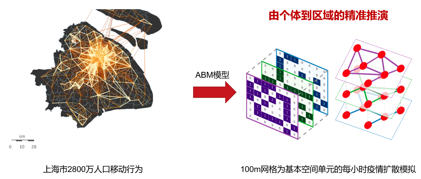 与此同时,为进一步助力科学决策,团队针对上海市疫情防控的特殊情形,如无症状、方舱隔离、密接隔离等策略,设计了新的传染病动力学(SH-SEIR)模型,并基于移动大数据推演居民的日常活动行为,构建了大规模智能体模拟系统。当设定模型推演的时空颗粒度为“百米网格·小时”时,能够实现基于2800万人口在个体层面移动行为之上的病毒传播仿真,以及不同防控策略效果的模拟分析。