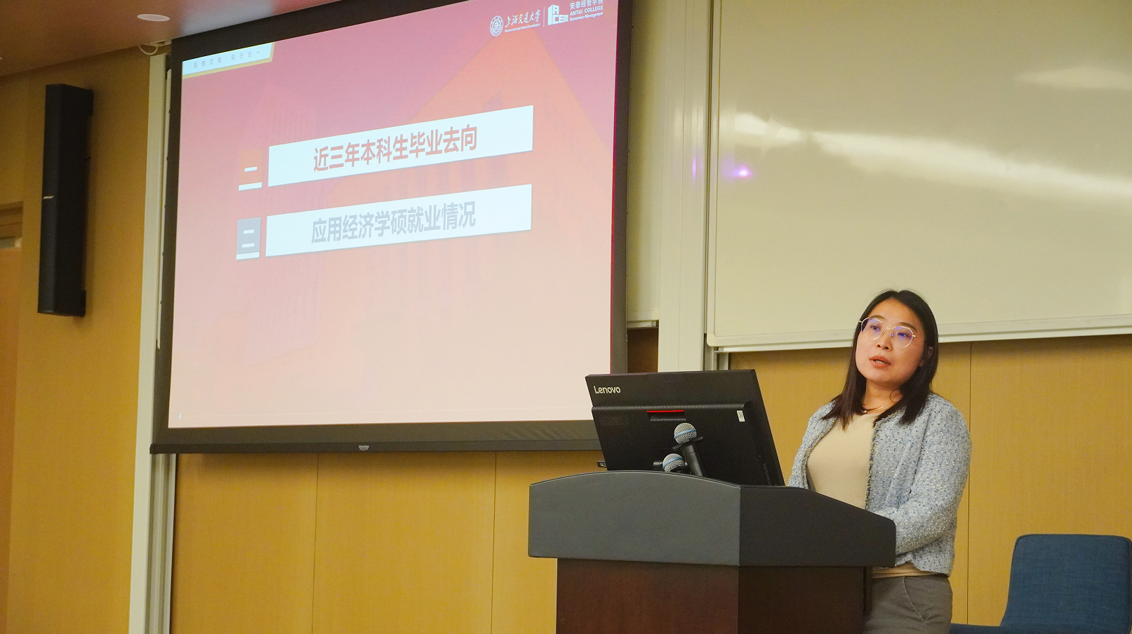 会议开始,员工工作与职业发展办公室的杨柳老师基于近三年就业数据,分析经济学本科毕业生去向,重点解读了应用经济学学术型研究生的职业发展案例,针对就业方向、行业趋势等方面为同学们提供了丰富的信息。杨老师也为同学们提出建议,希望大家结合专业定位和个人优势,尽早规划职业发展路径。
