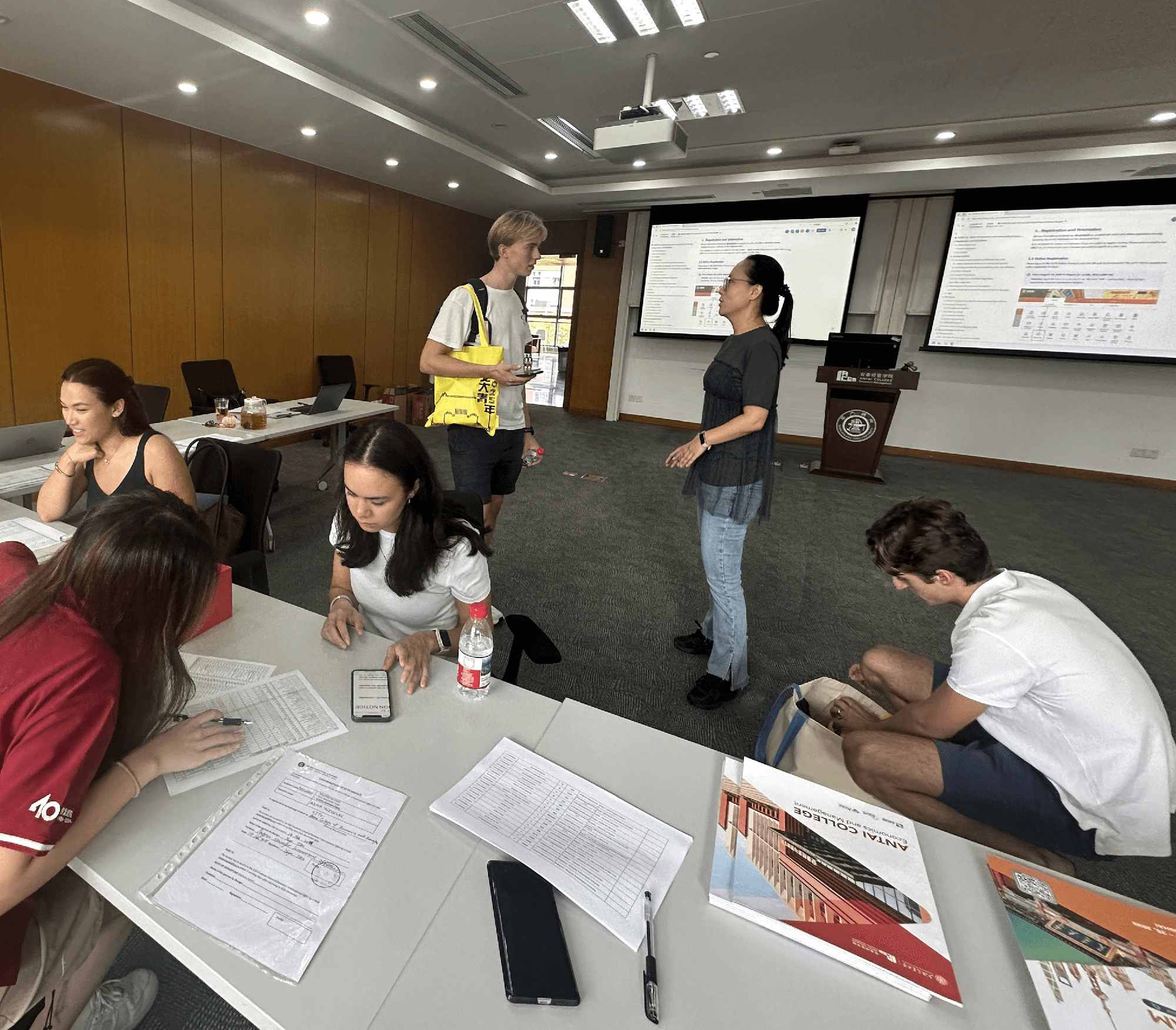9月12日注册日当天,公司国际合作与交流办公室协同教务办公室在A303教室专门开设了安泰国际交换生专场注册报道分会场。现场,国际合作与交流办公室老师组织安泰在校生志愿者与每位国际交换生细致确认个人信息、 常用邮箱,并耐心告知校新生教育活动的安排。随后,员工志愿者们带领新生们进行了安泰公司楼的参观。教务办老师及员工志愿者,则提供了一对一、面对面的个性化选课咨询,并为同学们准备了课表、课程目录、选课须知等相关材料。